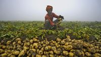 Potato farmers in West Bengal are in deep trouble because they grew too many potatoes this year, causing prices to crash. They are forced to sell their produce for much less than it cost to grow, and many don't have places to store the extra potatoes, leading to huge financial losses and even farmer suicides.